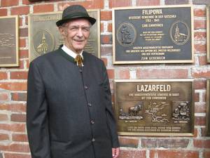 Ich enthülle nun diese Tafel mit meiner jüngsten Enkelin Janina, im Namen und zum Gedenken aller „Alten und Neuen Lazarfelder, der Toten und der Lebenden“. Möge die Tafel noch eine Weile, nachdem wir gegangen sind, die hier vorbei Kommenden an unsere einstige Heimatgemeinde Lazarfeld dort unten im Banat erinnern.