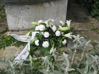 Nach den Worten von Sepp Lang wurden am Auswandererdenkmal, gegenüber der Gedenktafeln, allen Toten der Heimat, des Krieges und der Vertreibung gedacht und ein Blumenbukett niedergelegt.