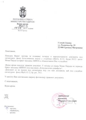 Jovica Stevic aus Mitrovica hat es vom Militärarchiv des Serbischen Verteidigungsministeriums auf seine Richtigkeit prüfen lassen und eine Originalkopie mit der Bestätigung erhalten, dass das Dokument echt sei.